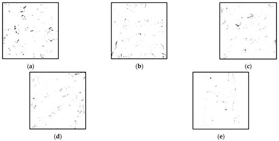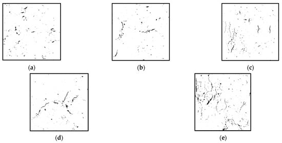 Gray images of pores and cracks of recycled concrete with different CGP contents: (a) specimen RAC-25-C-0, (b) specimen RAC-25-C-5, (c) specimen RAC-25-C-10, (d) specimen RAC-25-C-15, and (e) specimen RAC-25-C-20.