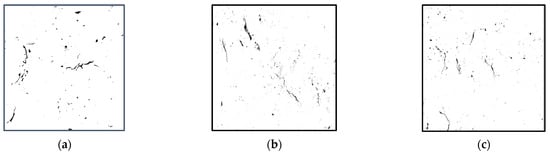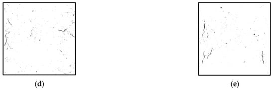 Firstly, the image was converted into a grayscale image, and the appropriate grayscale value was selected to mark the cracks in the image. Then, the grayscale ratio corresponding to the cracks was measured. The number of pixels in the image was divided by the total number of pixels in the image. The ratio obtained is the ratio of the crack area.