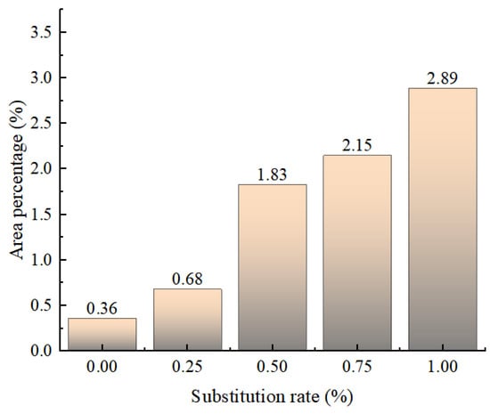 Through comprehensive analysis, it can be seen that the density of internal pores and cracks after concrete failure will increase with the increase in the replacement rate of 10–20 mm recycled coarse aggregate. At the same time, the proportion of cracks also gradually increases. As shown in Figure 29, when the replacement rate of recycled aggregate exceeds 25%, the proportion of cracks increases sharply, increasing by nearly 1.7 times.