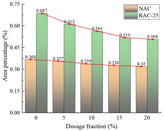 When the concrete is not mixed with CGP, the density of internal pores and cracks after the failure of the specimen is significantly greater than that of the specimen mixed with CGP, and the crack width is larger. With the increase in the CGP content, the proportion of cracks in the original concrete NAC specimens gradually decreases, but the change range is relatively gentle. When the content exceeds 15%, it reaches stability. At this time, the proportion of cracks is 0.38%, which is 9% lower than that of the NAC specimen. For recycled concrete specimen RAC-25, after adding CGP, the proportion of cracks obviously decreases with the increase in the CGP content (Figure 30).
