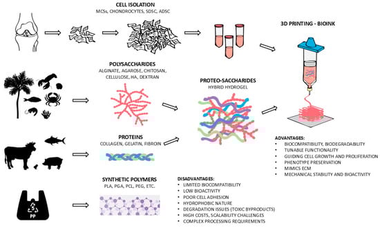The effectiveness of tissue engineering primarily relies on selecting materials, which form the foundation for scaffold creation to support cell attachment, growth, proliferation, and differentiation [32]. The choice of materials for biomedical applications has evolved significantly, focusing on developing advanced, intelligent materials to meet specific tissue engineering needs [33]. One of the most important aspects of CTE is the development of scaffolds that support chondrogenesis and preserve the chondrocyte phenotype to promote cartilage regeneration. Traditionally, various natural or synthetic materials have been used in CTE. However, the widespread clinical application of synthetic polymers is hindered by several disadvantages, including limited biocompatibility, which may trigger inflammatory responses, poor cell adhesion due to the absence of bioactive sites, lack of bioactivity, and a hydrophobic nature that can restrict nutrient exchange and cell infiltration. Additionally, degradation issues, such as unsynchronized breakdown with cartilage regeneration or the release of toxic byproducts, further limit their effectiveness. Moreover, high costs, scalability challenges, and complex processing requirements pose significant barriers to their practical use in CTE [34,35].