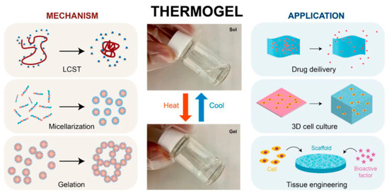 A representative illustration of thermogelling activity highlights various uses of thermogels and their thermoresponsive mechanisms [55].