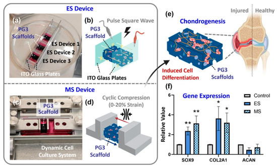 Schematic presentation of electrical and mechanical stimulation and their beneficial effect on chondrogenesis. Significant increases in chondrogenic gene markers SOX9 and COL2A1 were noted compared to the control group. ** p < 0.01, * p < 0.05. Reprinted with permission [82]. Copyright 2023. American Chemical Society.