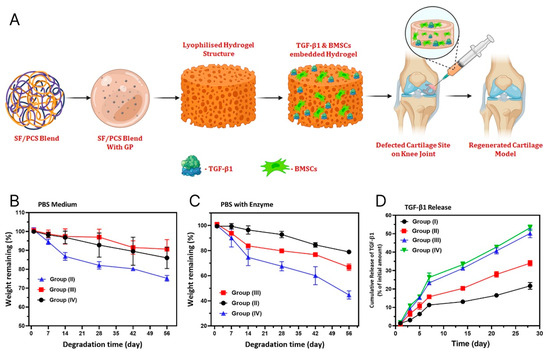 (A) Illustration of TGF-β1 and BMSCs encapsulated SF/PCS injectable hydrogel. (B) and (C) show in vitro biodegradation analysis (%) of blended hydrogel groups in PBS medium without and with enzymes (protease XIV and Lysozyme), respectively. (D) The diagram shows the in-vitro release of TGF-β1 from hydrogels of variable blending ratios of SF/PCS groups [112]. Copyright 2022, John Wiley & Sons.