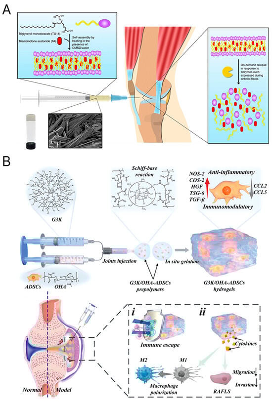 (A) A self-assembling injectable hydrogel with anti-inflammatory and immunomodulatory properties for the treatment of inflamed joints [54]. Copyright 2018, Springer Nature. (B) An innovative ECM-mimicking injectable hydrogel designed for adipose-derived stem cell encapsulation and delivery in RA treatment [54]. Copyright 2023, John Wiley & Sons.