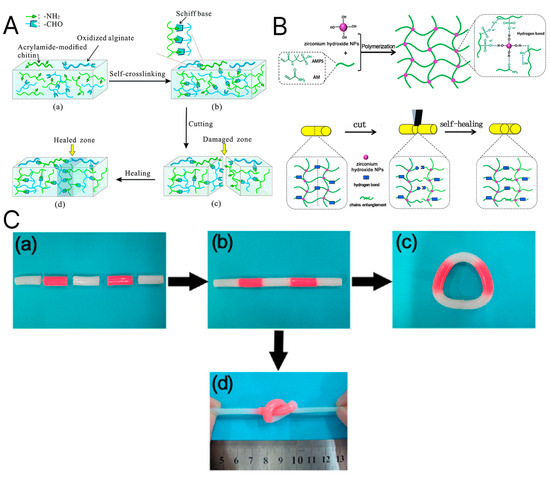 (A) Schematic illustration of the self-healing process. (a,b) Schiff-base linkage forms dynamic covalent bonds between aldehyde and amino groups. (c,d) If separated and put in contact, the hydrogel heals autonomously [166]. (B) A similar effect is noted in zirconium hydroxide nanocomposite hydrogels, forming hydrogen bonds. (C) The separated blocks were connected at room temperature without an external stimulus (a,b). The healed hydrogel showed mechanical stability, allowing it to be brought into a circle (c) as well as be knotted and stretched (d). Reprinted from Publication [167]. Volume 140. Copyright 2017, with permission from Elsevier.