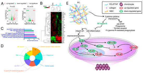 (A,B) Transcriptome profiles of chondrogenic differentiation of MSCs driven by nanofibers with (PC) and without collagen I (P). (C,D) KEGG pathway analysis predicts seven candidates for signaling pathways. (E) The proposed mechanism underlines chondrogenesis driven by PC nanofiber membranes. Reprinted from Publication [175]. Volume 178. Copyright 2018, with permission from Elsevier.