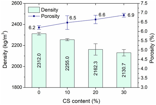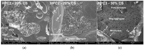 - Porosity and water absorption increase with higher coal slag content. For HPC with 30% CS, porosity and absorption increase by 10.6% and 11.3%, respectively, compared to the reference mix, while the density decreases by up to 7.8%.