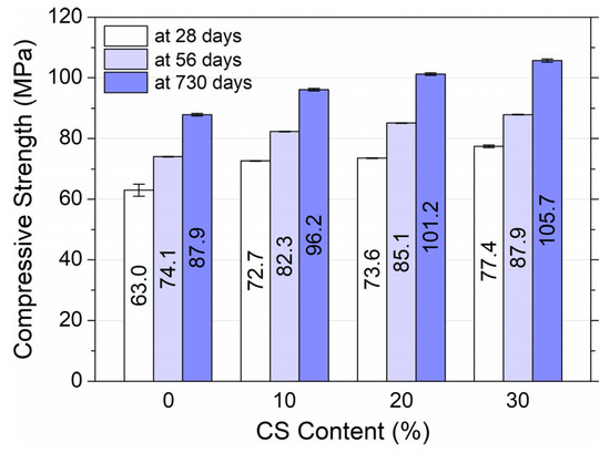 - Compressive strength improves significantly with the addition of CS. After 28 days, strength increases range from 15.4% (10% CS) to 22.9% (30% CS), and after 730 days, from 9.4% to 20.2%.