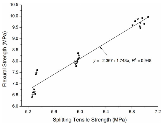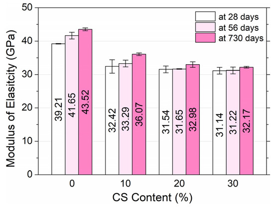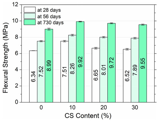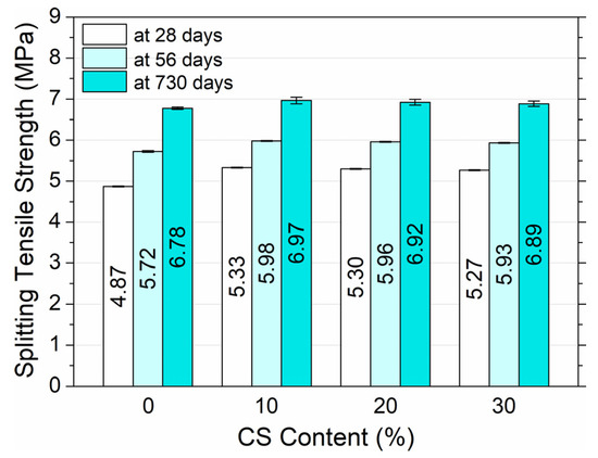 - The flexural and splitting tensile strengths also benefit from CS incorporation, showing consistent growth over time. The splitting tensile strength increases by 8–9% at 28 days and increases by 2–3% at 730 days. Flexural strength improves, especially in the early curing stage, most notably at 10–20% CS.