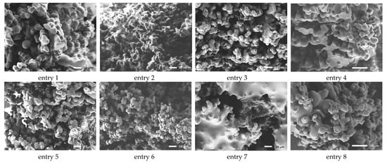 The particle sizes of the LPEI-MCTCD porous polymers decreased with increasing molecular weight of LPEI (LPEI50K, LPEI500K) and with higher [MCT]/[NH] feed ratios, as shown in Figure 2 and summarized in Table 1. The increase in LPEI molecular weight increased the viscosity of the reaction systems, which likely decreased the phase separation rate. As a result, the morphology was fixed at the early stage of the phase separation. An increase in the [MCT]/[NH] feed ratio should effectively increase the network formation rate due to the higher crosslinking density in the polymer networks. Disordered bulky structures, likely resulting from incompletely phase separated parts, were observed in the porous polymer obtained under conditions with [MCT]/[NH] = 0.5 mol/mol, especially in the sample of entry 7. The composition of the MeOH/H2O mixed solvent used in the reactions to prepare the LPEI-MCTCD porous polymers also affected the morphology and particle size. An increase in H2O content in the mixed solvent would increase the network formation rate due to an increase in basic dissociation constant, thereby fixing the morphology with small particle sizes at the early stage of phase separation.