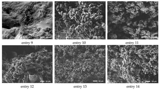 SEM images of the PAA-MCTCD porous polymers are shown in Figure 3. The average particle sizes of the PAA-MCTCD porous polymers were smaller than those of the LPEI-MCTCD porous polymers. High reactivity of the primary amine in the PAA side chain should accelerate the network formation rate, inducing fixation of the morphology at the early stage of phase separation. The reactions under the conditions of [MCT]/[NH] = 0.5 mol/mol and a lower materials concentration of 20 wt% (entries 9 and 12) formed a disordered morphology, likely derived from incomplete phase separation due to low phase separation rates. An increase in material concentration would accelerate phase separation, resulting in a morphology with connected particles (entries 10 and 13). In the reaction system of PAA1600-MCTCD, an increase in the [MCT]/[NH] molar ratio decreased the particle size in the resulting porous polymer (entry 11). The opposite result was observed in the PAA3000-MCTCD system (entry 14). One possible explanation for the result is a difference in preferential acceleration by the increase in [MCT]/[NH]—that is, the network formation rate in the PAA1600 system versus the phase separation rate.