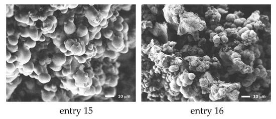 The standard deviation (SD) and coefficient of variation (CV) of the particle diameters are summarized in Table 1. The present porous polymers exhibited large CV values of more than 0.2. The LPEI500K-MCTCD porous polymer (entry 7: [MCT]/[NH] molar ratio of 0.5 in MeOH/H2O: 10 wt%/90 wt%) and PAA-MCTCD porous polymers (entries 9 and 12: [MCT]/[NH] molar ratio of 0.5) displayed disordered bulky structures with small, connected particles. The PAA3000-MCTCD and EPL-MCTCD porous polymers showed a bimodal particle size distribution (co-existence of small and large particles). One possible explanation for the wide distribution of sphere diameters is the coexistence of different concentrations in the reaction system, derived from phase equilibrium during the spinodal decomposition process, as previously reported in other reaction systems [31,32,33].
