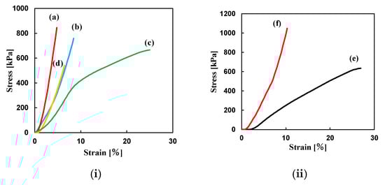 Stress–strain curves of (i) LPEI-MCTCD porous polymers: (a) LPEI50K (entry 1), (b) LPEI500K (entry 3), (c) LPEI50K (entry 5), and (d) LPEI500K (entry 7); and (ii) PAA-MCTCD porous polymer: (e) PAA1600 (entry 10) and (f) PAA3000 (entry 13).