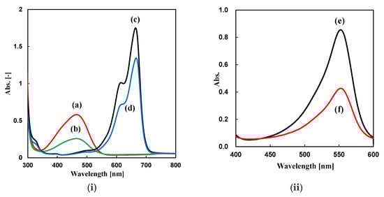 UV-Vis spectra of the (i) (a) original MO solution, (b) MO solution after the adsorption test, (c) original MB solution, (d) MB solution after the adsorption test, (ii) (e) original PP solution, and (f) PP solution after the adsorption test.