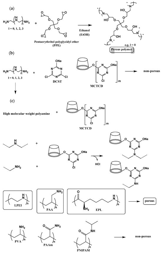 Chlorotriazine shows high reactivity with the amine group. Addition reactions between dichlorotriazine and diamine molecules yield linear and network polymers [21,22,23]. Crosslinking reactions of amine-based polymers with multi-functional chlorotriazine molecules, such as monochlorotriazinyl-β-cyclodextrin (MCTCD), represent an effective approach to forming network polymers. Uyama and co-workers reported the synthesis of monolithic porous polymers via an addition reaction of MCTCD and PEI in water [24]. The resulting monolithic polymers adsorbed various dyes through encapsulation with the β-cyclodextrin (β-CD) moiety in MCTCD. Their findings suggest the potential of MCTCD as a multi-functional crosslinking molecule with polyamines. Recently, we reported ring-opening addition reactions between low molecular weight linear polyethylene amine, such as ethylenediamine, diethylenetriamine, triethylenetetramine, tetraethylenepentamine, and a tetra-functional epoxy compound, pentaerythritol polyglycidyl ether, to yield network polymers, including porous polymers induced by phase separation (Scheme 1a) [25]. We have investigated the preparation of the porous polymers through a series of considerations. We applied multi-functional chlorotriazine molecules, 4,6-dichloro-2-sodiooxy-1,3,5-triazine (DCST) and MCTCD, on behalf of the tetra-functional epoxy, as crosslinkers of these polyethylene amine molecules (Scheme 1b). Although the network polymers were obtained by the reactions between the low molecular weight linear polyethylene amine and DCST or MCTCD, porous polymers were not produced. We found that reactions between high molecular weight linear polyethyleneimine (LPEI) and MCTCD in methanol/water mixed solvent could produce porous polymers. We are developing porous polymers with CD moieties using several methods [26]. Judging from our results, a combination of CD molecules and polymer materials is important to control the mechanical and physical properties of the resulting porous polymers. Variations of polymer materials should expand the application possibilities. We have investigated the preparations of the porous polymers with CD moieties using a series of polyamines, including amine groups in the main chains or in the side chains. In this paper, we report the nucleophilic substitution reaction between several polyamines and MCTCD to yield the porous polymers (Scheme 1c). We particularly focus on the effect of the molecular structure of these polyamines on the state of the resulting polymers and the morphology and mechanical properties of the porous polymers.