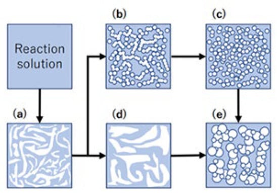 A model of polymerization-induced phase separation via spinodal decomposition process: (a) co-continuous structure at the early stage of phase separation, (b) transition state from co-continuous structure to small particles, (c) formation of small particles, (d) growth of the co-continuous structure, and (e) large particles derived from growth of the particles or grown co-continuous structure by interfacial tension, arrow means progress of the phase separation.