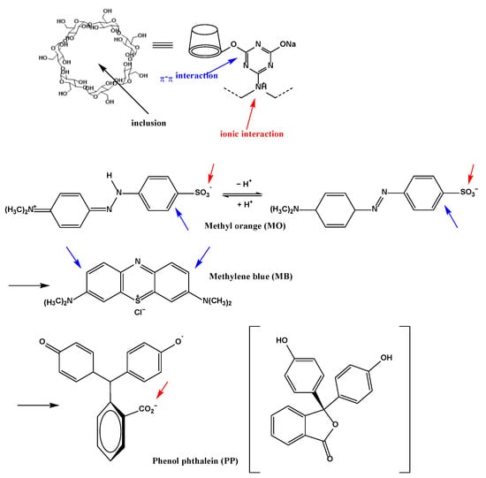 The resulting porous polymers with MCTCD have some characteristic moieties in the polymer networks, tertiary amine, triazine, and β-CD, whose structures should be applicable for adsorption of molecules from solutions. The β-CD moiety can incorporate organic compounds via a host–guest mechanism. The positive-charged surface derived from tertiary amine groups can absorb the molecules with a negative charge. Furthermore, triazine moiety derived from MCTCD may adsorb aromatic molecules through π–π interactions. As model cases, we investigate the adsorption of methyl orange, methylene blue, and phenolphthalein by an LPEI-MCTCD porous polymer.