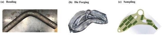 Figure 1 illustrates the primary forging process workflow. The initial billets were sectioned to 680 mm lengths (Figure 1a). During the process, the billets underwent bending to 108 ° using a mandrel bender to approximate the component’s final geometry and curvature (Figure 1b, Step 2). Subsequent forging operations were conducted on a 1500-ton hydraulic press equipped with heated upper and lower dies featuring intricate internal geometries corresponding to an automotive suspension’s lower control arm (Figure 1c). Prior to forging, the raw material underwent furnace heating to predetermined temperatures (250 °C, 350 °C, and 450 °C) for a sufficient duration to ensure thermal uniformity. The heated billets were then transferred to isotherm molds, where the hydraulic press applied pressure at a constant displacement rate of 20 mm/s to complete the forging operation in a single step, achieving the target component geometry. Notably, the forging direction was maintained perpendicular to the original extrusion axis. Graphite lubricant was employed throughout the process to reduce frictional effects. Following forging, the specimens were extracted from the molds and allowed to air-cool at ambient temperature without subsequent heat treatment.