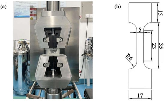 Slow strain rate tensile (SSRT) tests were performed on AZ80 magnesium alloy substrates, MAO, and MCC-coated specimens using a microcomputer-controlled universal testing machine with corroded vessels (Figure 2a). The specimens, with dimensions illustrated in Figure 2b, were tested at a constant strain rate of 10−5/s with a minimum loading rate of 0.012 mm/min. Prior to testing, each specimen was carefully aligned between the lower base and upper loading head to ensure proper load application. All tests were conducted in a 3.5 wt.% NaCl solution environment to evaluate the stress corrosion cracking (SCC) resistance. For each material condition, a minimum of three replicate tests were performed to ensure data reliability. Throughout testing, the applied load, fracture time, and displacement were continuously recorded. Tests were terminated upon complete specimen fracture and separation. Post-fracture analysis was conducted using SEM to examine the fracture surface morphology and determine the dominant failure mechanisms. The SCC susceptibility was evaluated based on the fracture characteristics and mechanical response during SSRT.