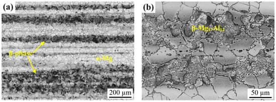 Figure 3 displays the characteristic microstructures at low magnification (a) and high magnification (b) of extruded AZ80 magnesium alloy (AZ80E). The optical micrograph reveals a typical two-phase structure consisting of an α-Mg matrix with dispersed β-phase (Mg17Al12) intermetallic compounds. The relatively high aluminum content (8 wt.%) in this alloy promotes the formation of these β-phase particles, which exhibit a pronounced lamellar morphology preferentially aligned parallel to the extrusion direction.