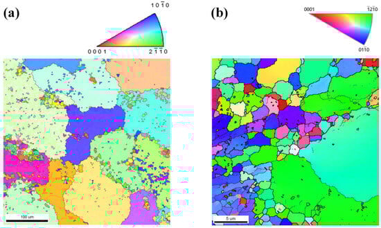 EBSD maps of (a) AZ80E alloy and (b) AZ80F-250 alloy.