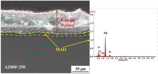 Cross-sectional morphology of the MCC coating on the AZ80F-250 substrate and EDS analysis of the MAO coating.