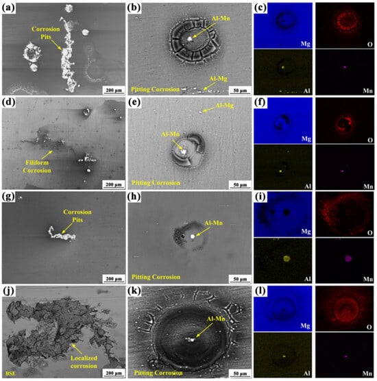 The surface corrosion morphologies of (a–c) AZ80E, (d–f) AZ80F-250, (g–i) AZ80F-350 and (j–l) AZ80F-450 alloys after continuous salt spray corrosion for 4 h, (c,f,i,l) are the EDX elemental mappings corresponding to (b,e,h,k), respectively.