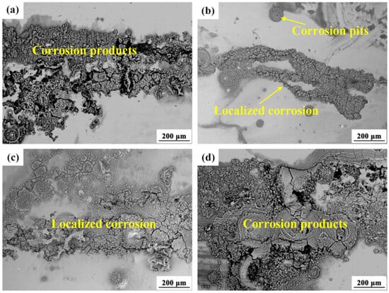 Compared to the substrate alloys, the MAO-coated specimens exhibited a significantly reduced corrosion rate, confirming the exceptional protective capability of the hard ceramic MAO coating for magnesium alloys. The phase composition and chemical constituents of MAO coatings on magnesium alloys are predominantly determined by the MAO electrolyte formulation and the substrate’s chemical composition. As a result, when different forged AZ80 alloys undergo identical MAO treatment, they develop coatings with comparable thicknesses, microstructural characteristics, and corrosion protection performance. After a standardized 6-day salt spray accelerated corrosion test, localized corrosion was observed on all AZ80 alloy specimens, with corrosive attack penetrating the MAO coating. This behavior can be attributed to the infiltration of corrosive media through micro-pores and micro-cracks in the MAO coatings, followed by the diffusion of aggressive ions beneath the coating (Figure 10). Upon coating fracture initiation (Figure 10b,c), the corrosion rate of the MAO-coated specimens becomes primarily governed by the inherent corrosion resistance of the underlying AZ80 substrate. In contrast, regions where the coating remained intact (Figure 10d) exhibited no signs of corrosion degradation. Consequently, the corrosion resistance ranking of the MAO-coated specimens closely mirrors that of their respective AZ80 substrate alloy.