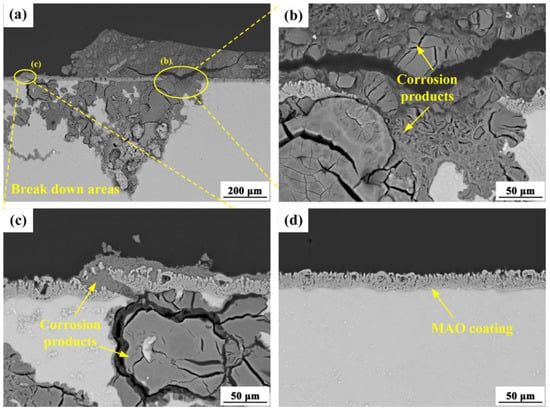 Cross-sectional morphology of the MAO coating on AZ80E alloy after 6 days of accelerated salt spray corrosion: (a–c) coating breakdown areas, (d) coating non-breakdown area.