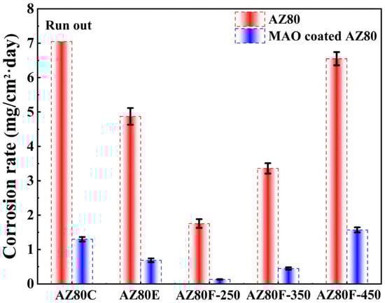 Corrosion rates of AZ80 magnesium alloy and MAO-coated specimens after 35 days of salt spray accelerated corrosion test under different forming processes.