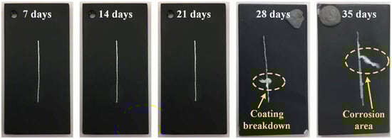 To comprehensively evaluate the adhesion and corrosion protection properties of the MCC coating, scratch testing was performed in accordance with the ASTM D1654 standard [30]. A standardized 0.5 mm wide scratch was introduced on each MCC-coated specimen, reaching through to the substrate material. The corrosion resistance was quantitatively assessed by measuring the corrosion creep perpendicular to the scratch, where smaller creep distances indicate superior coating performance. Figure 12 presents the macroscopic evolution of scratch specimens subjected to salt spray accelerated corrosion testing over periods of 7, 14, 21, 28, and 35 days. Notably, the MCC coating demonstrated exceptional performance, with no observable general corrosion or rust creep along the scratch during the first 21 days of exposure. Initial signs of degradation became apparent at 28 days, manifesting as minor corrosion near the scratch and the onset of coating cracking. By 35 days, localized corrosion creep became evident along the cracked regions of the coating. These scratch test results confirm that MCC coating exhibits both excellent corrosion resistance and strong interfacial adhesion to the substrate. The delayed onset of corrosion creep and the limited progression of damage even after extended exposure highlight the coating’s robust protective capabilities.