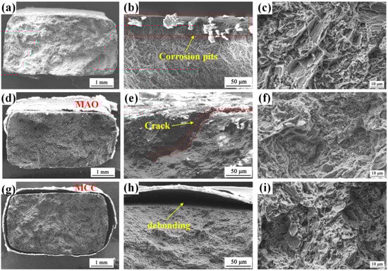 SEM images of the fracture morphologies of AZ80F-250, AZ80F-250 + MAO, and AZ80F-250 + MCC specimens in SSRT (a,d,g) overall, (b,e,h) crack initiation zone, and (c,f,i) final fracture zone, respectively.