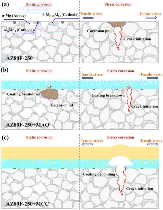 Schematic diagram of the static/stress corrosion mechanisms of (a) AZ80F-250 substrate, (b) MAO-coated specimen, and (c) MCC-coated specimen.