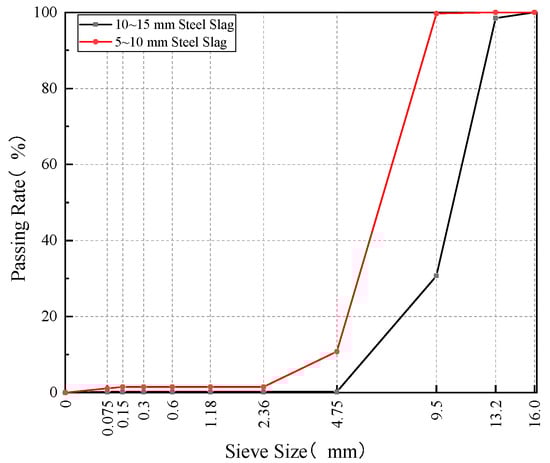 In this study, steel slag was utilized as the coarse aggregate. Two size ranges of steel slag coarse aggregate (5–10 mm and 10–15 mm) were selected. The basic properties and sieving results of the two steel slag particle sizes are shown in Table 1 and Figure 1, respectively.