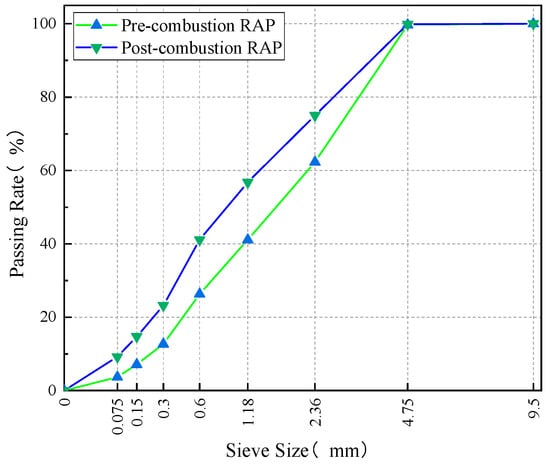 RAP supplied by a maintenance company in Shandong Province was used in this study. The crushed fines portion (0–5 mm) of RAP was selected for testing. To evaluate the performance of the aged asphalt in the RAP, the asphalt was extracted and recovered in accordance with China Standard Test Methods [27]. The basic performance indicators of the aged asphalt were then tested. The test results are presented in Table 2. It can be seen from Table 2 that the degree of aging of aged asphalt in RAP is not severe, and it can be used for hot central plant recycling [28]. The asphalt content in RAP was determined using the combustion furnace method according to China Standard Test Methods JTG E20-2011, Section T 0735-2011 [27], and the burned RAP aggregate was subjected to sieve analysis. The average aged asphalt content is 6.8%. The apparent specific gravity and bulk specific gravity of the RAP aggregate are 2.746 and 2.603, respectively. Aggregate sieving results before and after RAP combustion are shown in Figure 2.