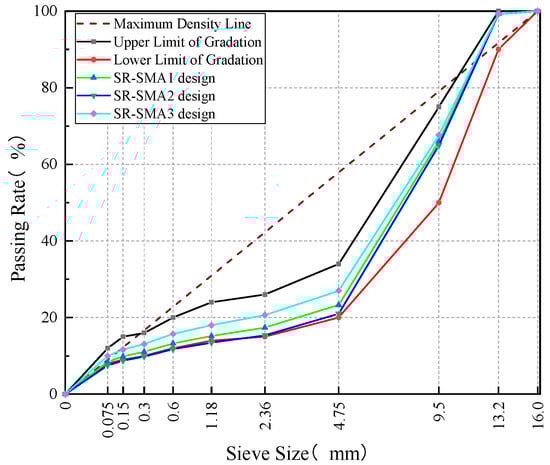 In accordance with the Technical Specification for Highway Asphalt Pavement Construction [29], three initial gradations (SR-SMA1, SR-SMA2, and SR-SMA3)—corresponding to 4.75 mm sieve passing rates of approximately 21%, 24%, and 27%, respectively—were proposed, as shown in Figure 3. The contents of RAP were 10.6%~14.4% by weight of total mineral aggregates for three initial gradations. The initial asphalt-to-aggregate ratio was determined to be 6.13% based on the estimation formula and engineering experience [30]. The contribution of the aged RAP binder is 0.72%~0.98% in the total asphalt-to-aggregate ratio. Since the RAP asphalt binder is not aged severely and its content in SR-SMA is very small, the blending chart and rejuvenating agent were not used in this study.