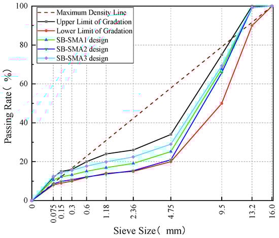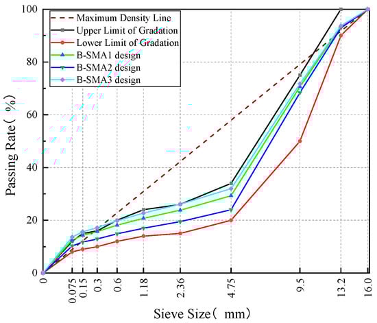 Steel slag was used as the coarse aggregate in the SB-SMA mixture, while basalt was adopted as the fine aggregate and limestone powder was employed as mineral filler. Similarly, according to Technical Specification for Construction of Highway Asphalt Pavement [29], three gradations (4.75 mm passing rate of about 21%, 25%, 29%) were initially proposed, shown in Figure 4. The initial asphalt-to-aggregate ratio was determined to be 5.8% by using the formula and referring to experience. Likewise, three groups of specimens were prepared, and key volumetric parameters were determined by the Marshall test method, and the results are shown in Table 8.