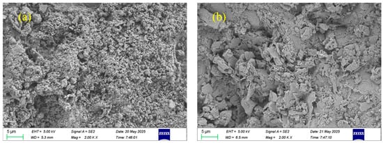 The surface microstructure images of steel slag and basalt aggregates are shown in Figure 6. From Figure 6a, it can be clearly seen that the surface of steel slag exhibits a distinct porous and agglomerated morphology, characterized by heterogeneous particle size distribution and loosely packed particles, resulting in notably high surface roughness. This highly irregular and porous microstructure significantly enhances the mechanical interlocking between the steel slag aggregate and asphalt binder, while also facilitating asphalt infiltration into the surface texture. Consequently, interfacial adhesion is effectively reinforced. Additionally, the increased specific surface area of steel slag offers abundant active sites for adhesion, further promoting asphalt wetting and encapsulation.