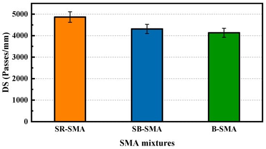 Three specimens for each SMA in the wheel-tracking test were carried out, and the results are shown in Figure 7 (the error bars shown in the Figure represent standard deviations).