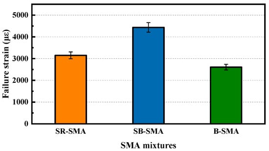 Based on the failure strain value in Figure 8, the low-temperature performance of the three SMA mixtures is ranked as BS-SMA, SR-SMA, and B-SMA. However, all of them meet the low-temperature performance requirements for modified asphalt mixtures in winter cold areas specified in China Specification [29]. Compared with the B-SMA, the failure strain value of SB-SMA is 1.7 times that of B-SMA, and the failure strain value of SR-SMA is 1.21 times that of B-SMA. This may be attributed to the improved adhesion between steel slag and asphalt. Although SR-SMA contains some fine RAP, its small content has minimal effect on low-temperature performance. Therefore, the low-temperature performance of SR-SMA is better than that of B-SMA. However, due to the influence of the aged asphalt in RAP, its low-temperature performance is lower than that of SB-SMA.