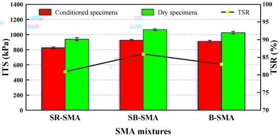 The indirect tensile strength test of four specimens, respectively, was carried out before and after the freeze–thaw cycle for each SMA, and the average values of indirect tensile strength of the dry group and conditioned group were taken to determine the TSR. The results are shown in Figure 9.