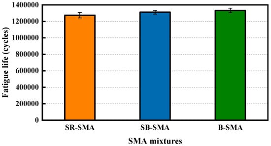Due to time constraints, the four-point bending fatigue test was performed only at a strain of 400 με. The fatigue life of the three SMAs, represented by the number of loading cycles (the average of four specimens), is shown in Figure 10. It can be seen from Figure 10 that SR-SMA exhibits the shortest fatigue life among the three SMAs. This may be attributed to the simultaneous application of steel slag and RAP in SR-SMA, resulting in the greatest initial stiffness modulus for SR-SMA. At the same strain level, the SR-SMA experiences the highest stress, leading to the fastest decrease in modulus, and consequently the least cumulative loading cycles.