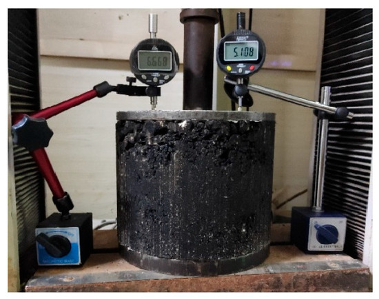 - The resilient modulus test was conducted in accordance with T0713-2000 of the Test Methods for Asphalt and Asphalt Mixtures in Highway Engineering (JTG E20-2011), utilizing a loading rate of 2 mm/min. The testing procedure is shown in Figure 1. The formula is shown in Equation (1).where Ec represents the resilient modulus; represents the compressive force under a level 5 load (MPa); h represents the axial height of the specimen (mm); and . epresents the resilient deformation corrected to the origin at a level 5 load (mm).