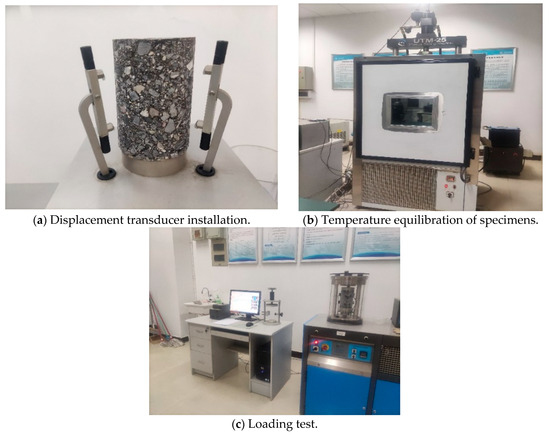- The dynamic modulus test was conducted in accordance with T0738-2000 of the Test Methods for Asphalt and Asphalt Mixtures in Highway Engineering (JTG E20-2011). The testing procedure is shown in Figure 2. The specimens were placed in an environmental chamber set to a specified test temperature with an accuracy of ±0.5 °C and maintained at a constant temperature for 4 h to 5 h until the desired test temperature was achieved, as shown in Figure 2b. During the testing process, the specimens were subjected to axial sine-wave loads at various test temperatures, ranging from a high to low frequency. The determination of each load frequency corresponded to the number of repetitions of the load under axial compressive stress and axial compressive strain, as shown in Figure 2c. The formula is shown in Equation (2):where E* represents the dynamic modulus (MPa), represents the axial stress amplitude (MPa), and represents the axial strain amplitude (mm/mm).