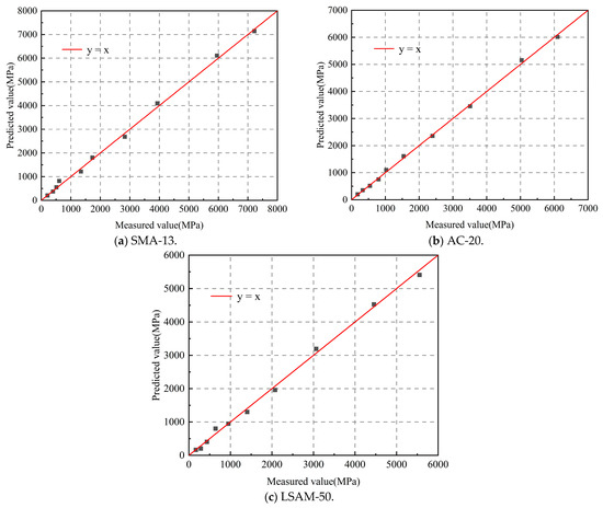 As shown in Figure 10, the dynamic modulus predicted values for the three LSAM-50 pavement materials are plotted against the measured values along the line y = x, which can be utilized to calculate the dynamic modulus as described in Equation (17).