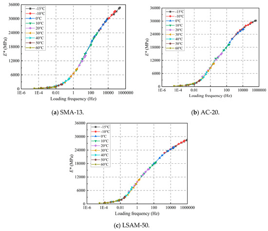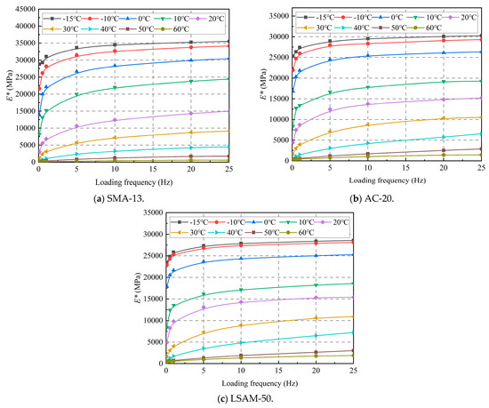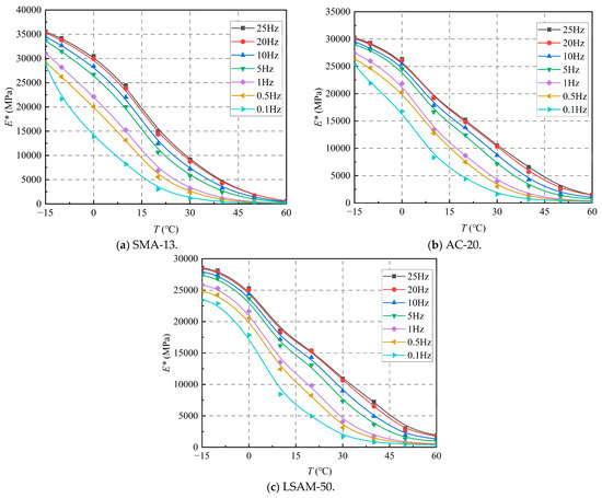 As shown in Figure 6, the dynamic modulus of the three LSAM-50 pavement materials exhibits a similar decreasing trend with increasing temperature across all loading frequencies. When the temperature is below 20 °C, the dynamic modulus decreases sharply. Conversely, when the temperature exceeds 40 °C, the rate of decrease in the dynamic modulus slows significantly. This phenomenon occurs because, as the temperature rises, the viscoplasticity of the asphalt increases, leading to a substantial unrecoverable plastic deformation under load. By the time the temperature reaches 40 °C, it approaches the softening point of the asphalt, resulting in a marked increase in viscoplasticity. Consequently, the deformation experienced under load transitions to predominantly unrecoverable plastic permanent deformation, which accounts for the significant reduction in the rate of dynamic modulus decrease.