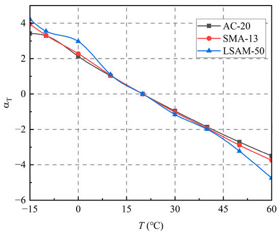 As shown in Figure 9, the displacement coefficients of the three LSAM-50 pavement materials show a similar trend over the test temperature range (−15 °C to 60 °C), and the ranges of values clearly overlap over the temperature range (10 °C to 45 °C). Overall, the displacement factors of the three LSAM-50 pavement materials differ, but not significantly. The displacement factor is a reflection of the temperature sensitivity of asphalt mixtures, indicating that the overall temperature sensitivity of the three LSAM-50 pavement materials converges. In addition, the similarity of the displacement factors verifies the applicability of the time–temperature equivalence principle (TTSP) in LSAM-50; the temperature–frequency superposition behavior is mainly determined by the asphalt-phase viscoelasticity rather than the aggregate geometric characteristics.
