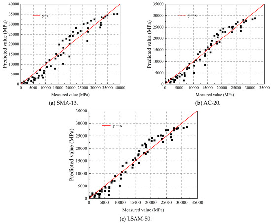 According to Equation (7), the predicted values of the resilient modulus have been obtained. A scatter plot is created to compare the predicted and measured values, with the measured values represented on the horizontal axis and the predicted values on the vertical axis, as shown in Figure 5.