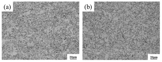 Metallographic structure of experimental steel base metal: (a) Steel A; (b) Steel B.